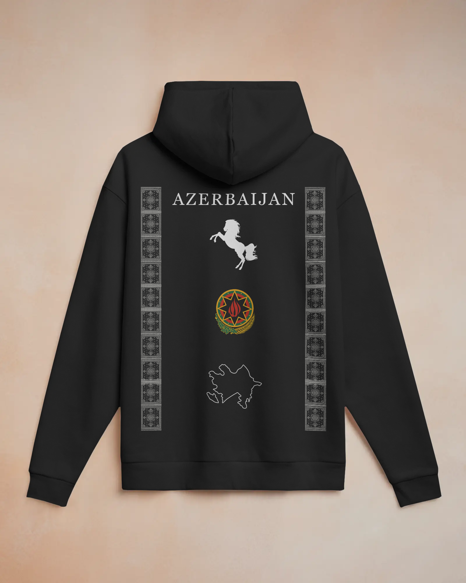 A bold tribute to the Land of Fire. This oversized hoodie features the Azerbaijani flag on the front and a striking back design with national emblems - from the roaring horse of strength to the carpet-inspired borders and map outline of the homeland. Built for comfort, pride, and identity.