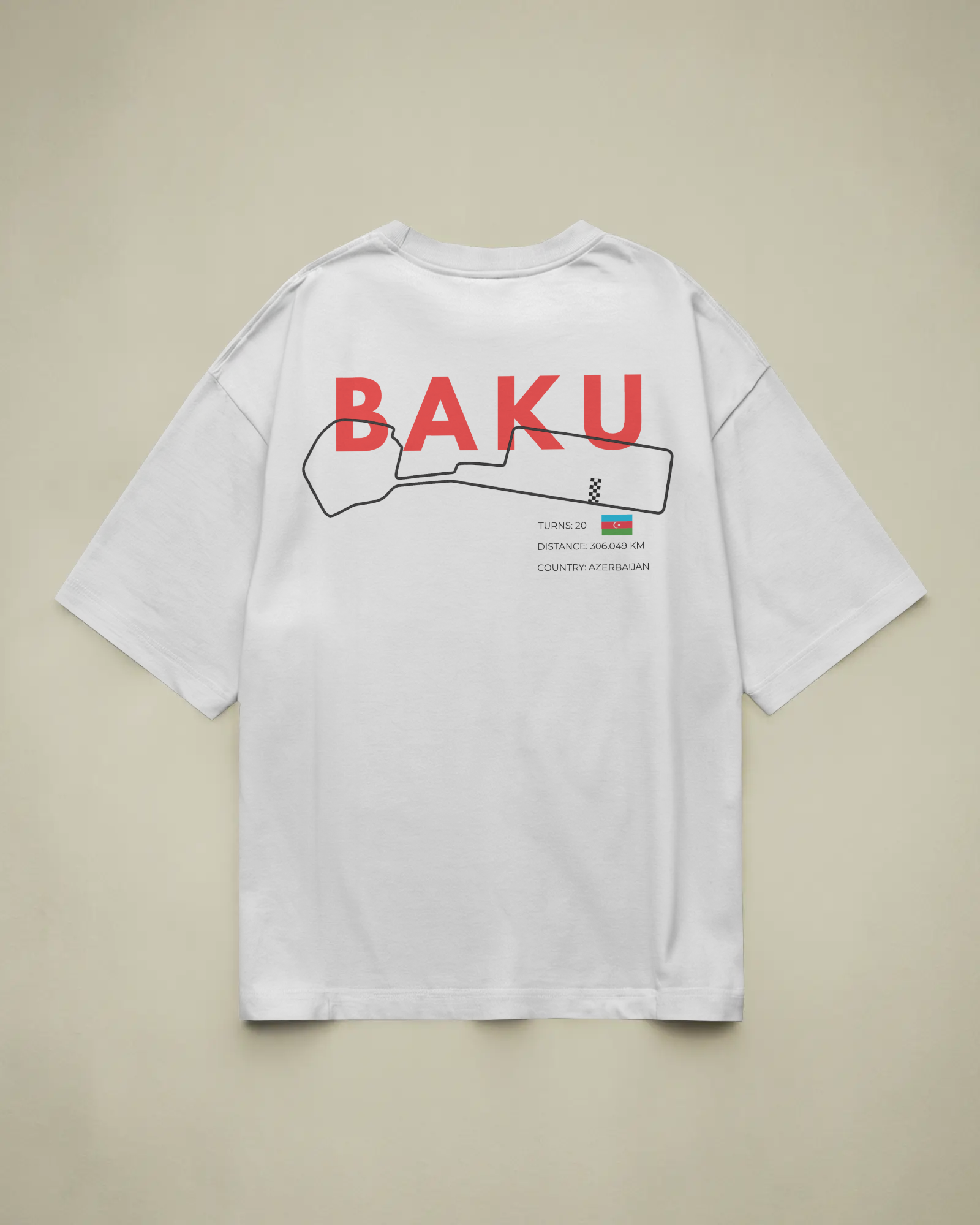 Show your love for the streets of Baku with the Baku City Circuit Tee. Featuring the official track layout, bold “BAKU” lettering, and race details including turns, distance, and the Azerbaijani flag, this tee is made for true F1 fans. Available in crisp white or sleek black, oversized for the perfect streetwear fit.